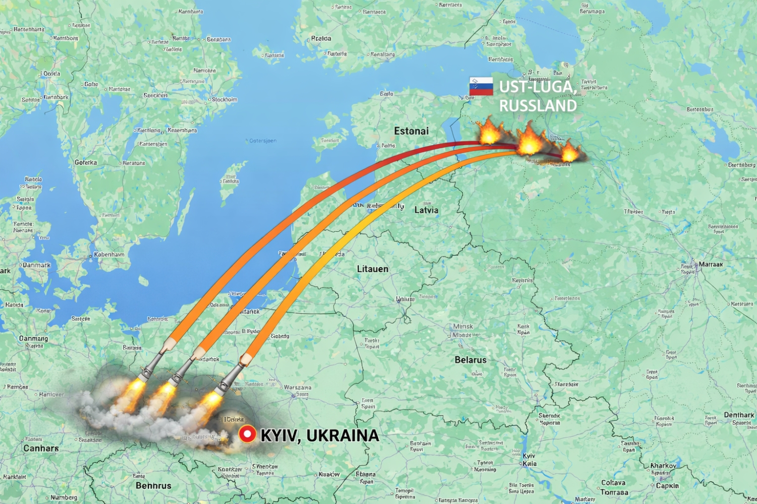 Ust-Luga ligger innerst i Finskebukta, omtrent 25 kilometer fra grensen til Estland. Havnebyen er sentral for russisk eksport av kunstgjødsel, olje og kull. Den har blitt angrepet flere ganger de siste dagene. Russlands luftforsvar sier de skjøt ned 38 droner på vei mot byen gjennom natten.