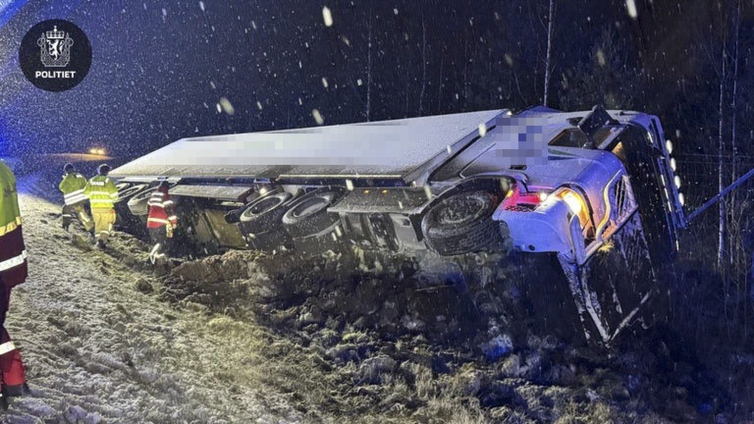 En lastebil med fisk veltet natt til lørdag på E16 sør for Åmålkrysset retning Maura i Akershus. En lastebil med fisk veltet natt til lørdag på E16 sør for Åmålkrysset retning Maura i Akershus. Foto: Politiet / NTB